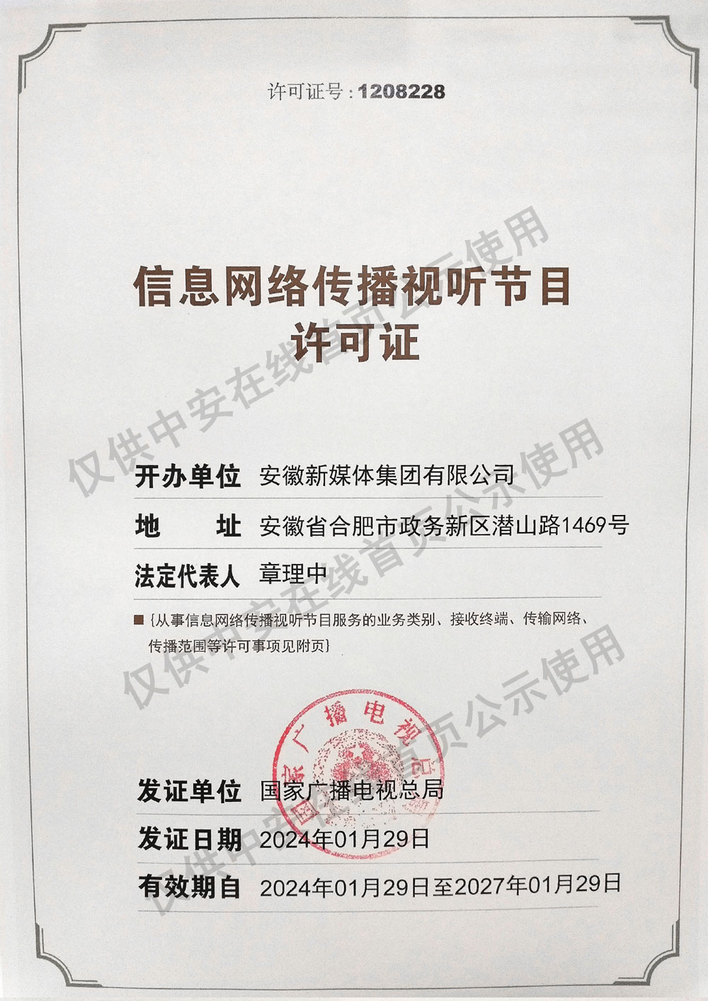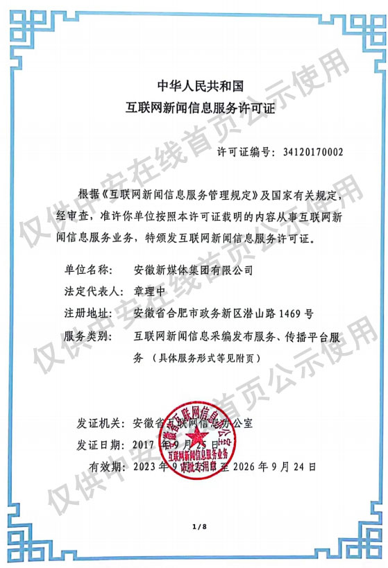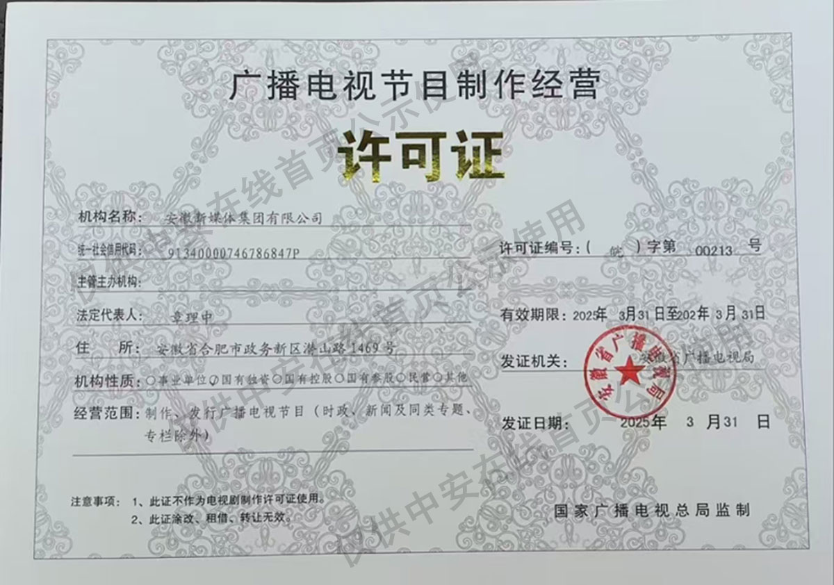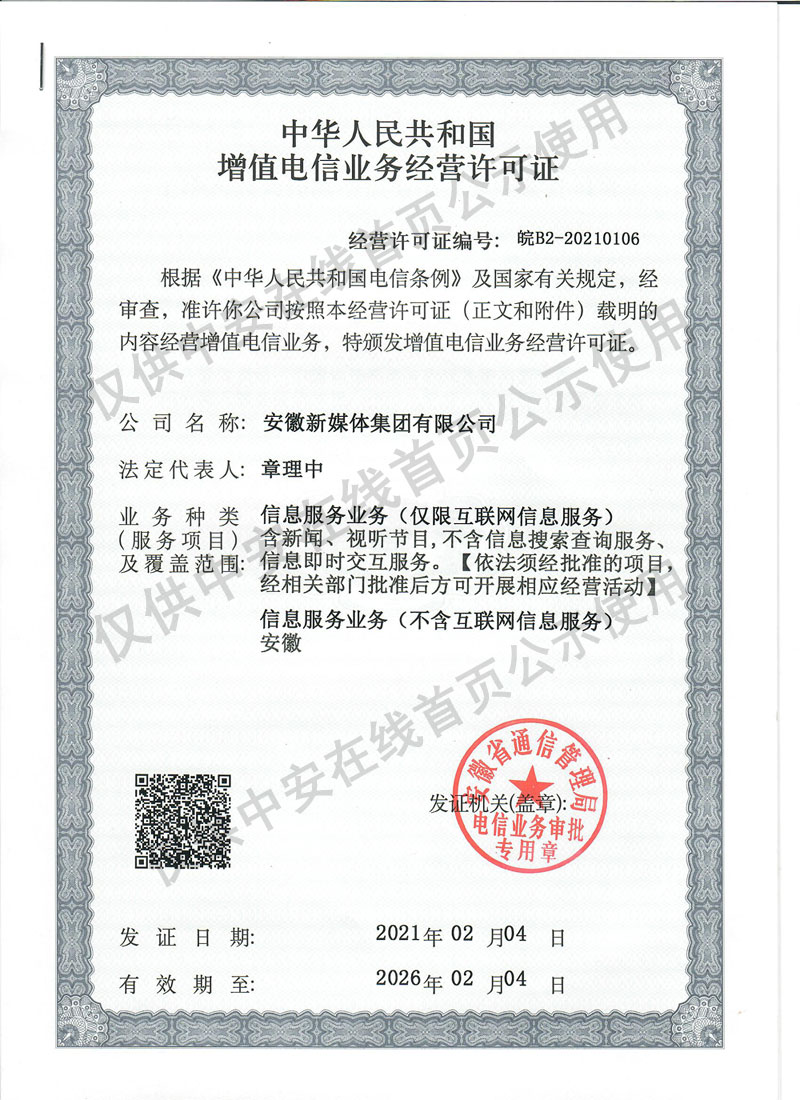 互聯網新聞信息服務許可證34120170002 增值電信業務經營許可證皖B2-20210106 廣播電視節目制作經營許可證皖字第00213號 信息網絡傳播視聽節目許可證1208228 皖ICP證皖B2-20080023-7 皖公網安備34010002000033號