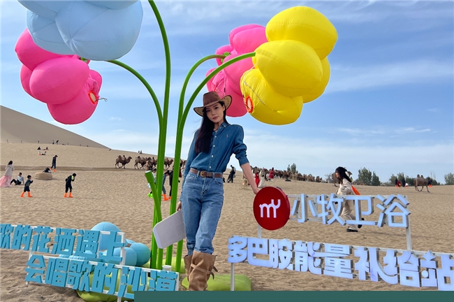 在小牧的“多巴胺能量補給站”打卡點,則打造了一個沒有天花板的K歌空間,明亮、多巴胺色彩注入年輕活力,花朵造型噴頭噴射出細密小氣泡,讓人仿佛置身夢幻衛浴場景,吸引了眾多年輕游客來到這里唱歌麥霸、釋放自我?!靶∧吝@款音樂花灑太好玩了!不僅音效好,而且氛圍感拉滿,整個多巴胺色彩,拍照都很出片!”來自敦煌本地的小姐姐說道。