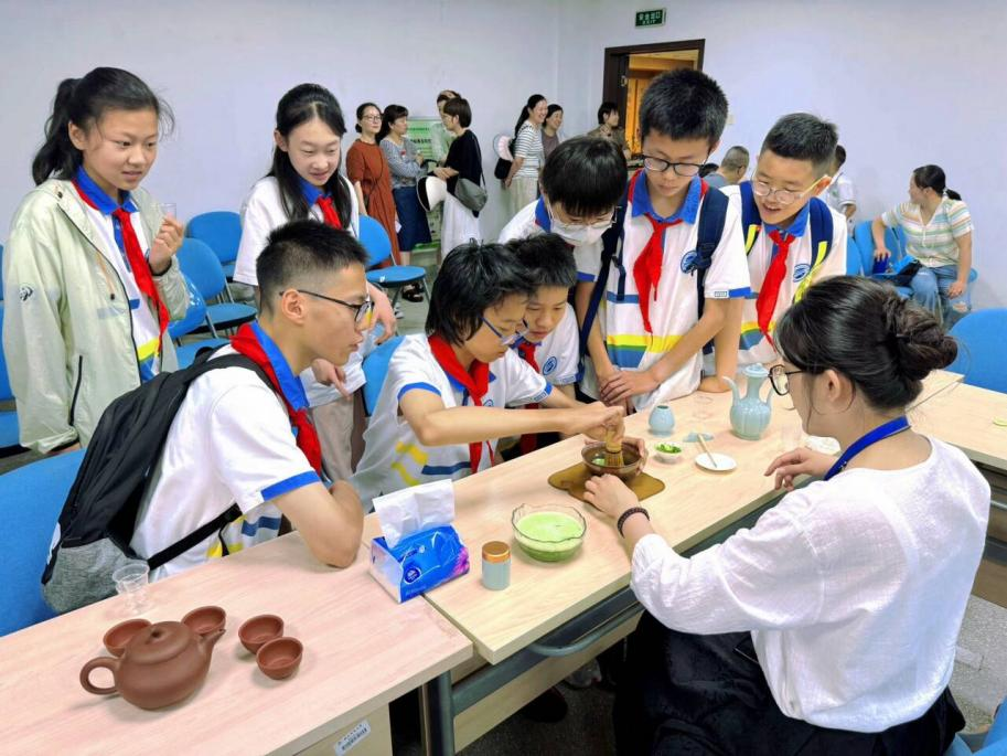 合肥市五十中學天鵝湖教育集團天鵝湖校區2023級(13)班、(15)班的同學們在老師的帶領下也來到安徽農業大學的科技周活動現場。安徽農業大學專家老師向同學們詳細介紹了茶的起源、干茶的分類及其加工方法、茶的健康、茶葉保鮮與貯藏、茶葉沖泡方法、茶葉深加工及其產品等科普知識,體驗炒茶、泡茶、倒茶、品茶,不僅感受到了茶葉的清香和甘甜,還深入了解了茶文化中蘊含的和諧、包容、謙虛、內斂等精神品質。