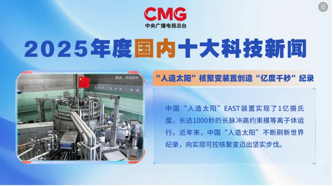 “人造太陽”核聚變裝置創造“億度千秒”紀錄入選2025年度國內十大科技新聞。
