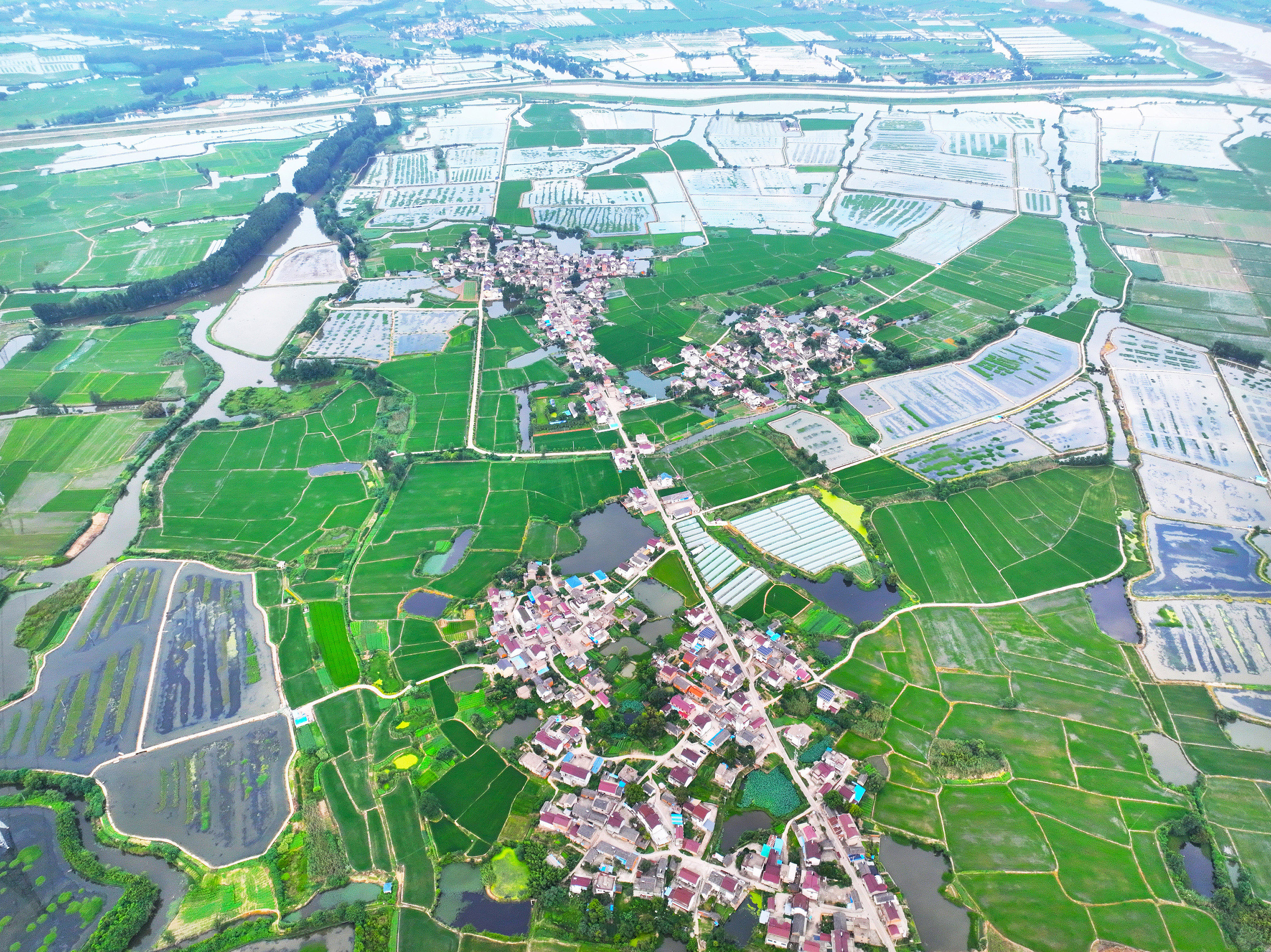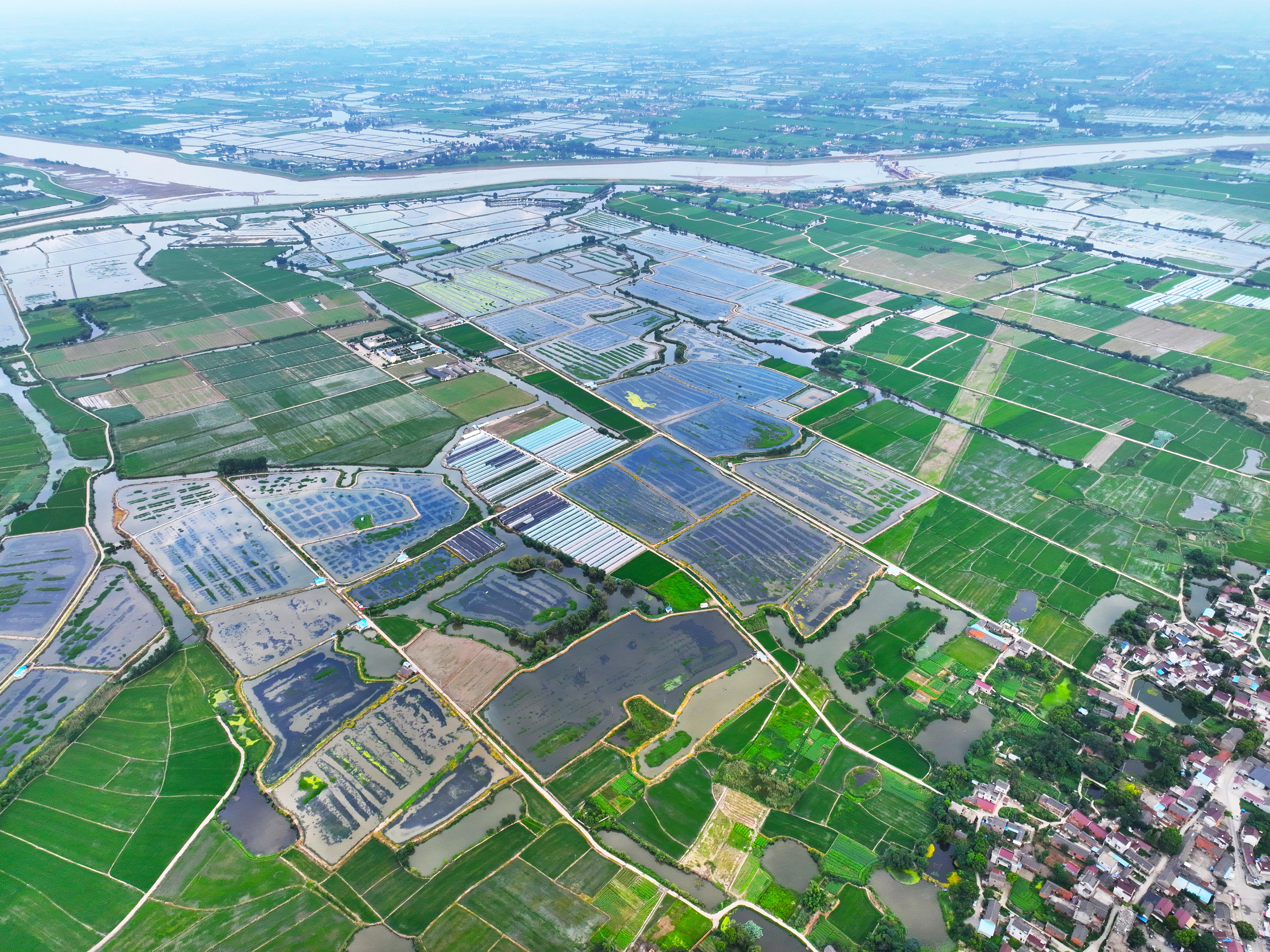 2023年7月15日,航拍安徽省馬鞍山市當涂縣姑孰鎮關馬村一帶,村莊、河流、道路和田野交相輝映,構成一幅美麗的和美鄉村生態畫卷。