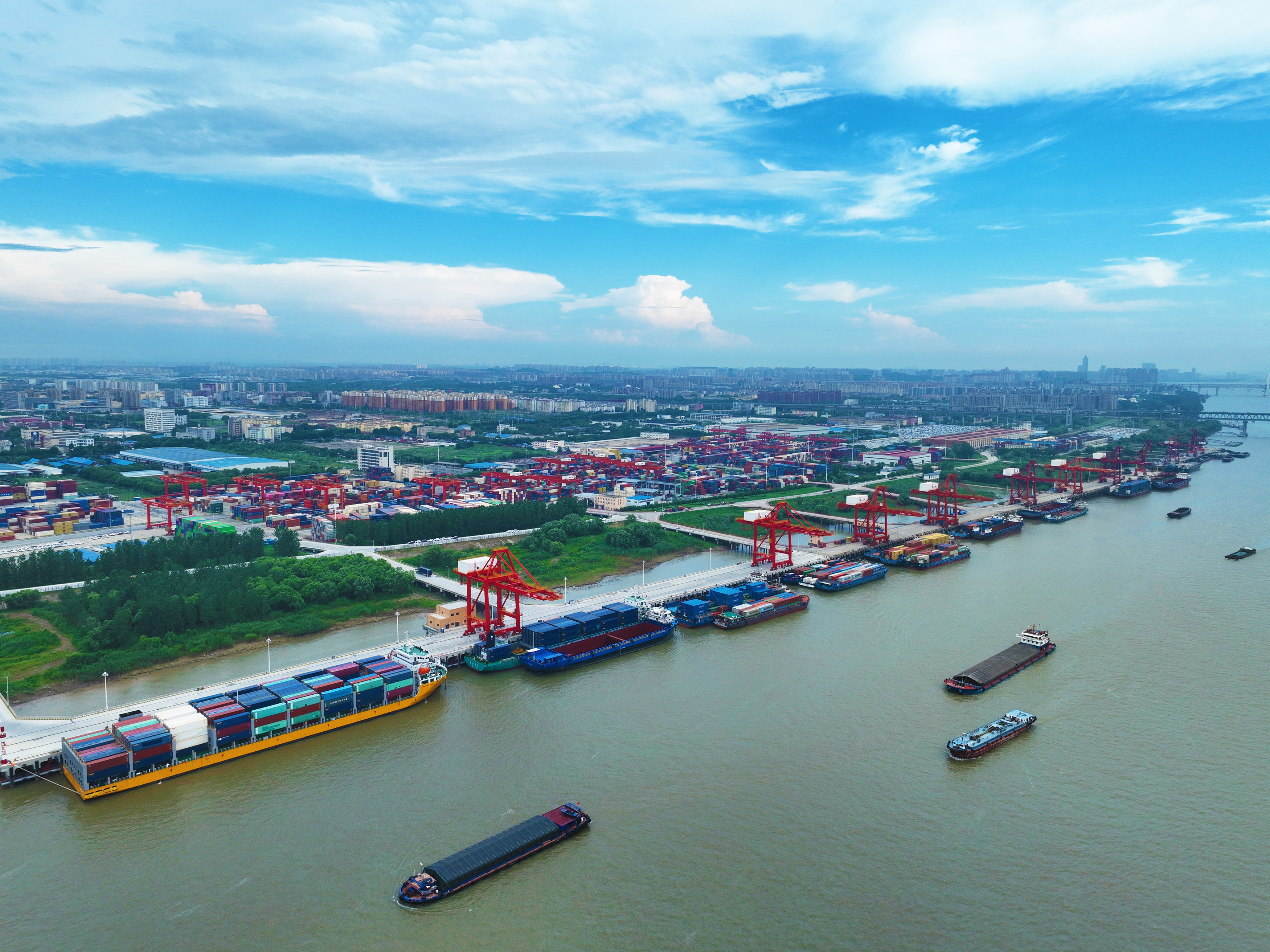 2023年7月17日,安徽港口蕪湖港朱家橋港區(qū)國(guó)際集裝箱碼頭,貨輪正在進(jìn)行集裝箱裝卸作業(yè)(無(wú)人機(jī)照片)。