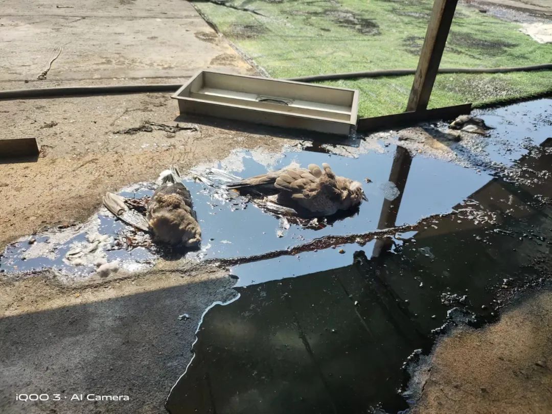 在淮河西路與蒙城路交口西北角的杏香園酒樓樓頂,幾臺油煙監測設備正在運行,根據顯示屏數據顯示,油煙濃度、顆粒物濃度和非甲烷總烴數值均為0mg/m³。在油煙在線監測設備下方地面,已經被從油煙管道滲漏出的油漬污染一大片。記者用木棍粗略地估測了一下,地面的油漬已有約1厘米厚,當記者欲將木棍拿走時,發現濃厚的油漬已經呈現“拉絲”狀。