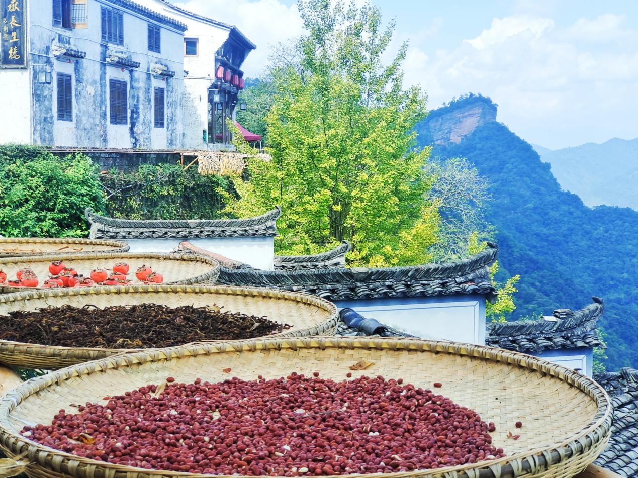步入月華天街,濃郁的秋收氣息撲面而來。村民們將圓圓的竹匾晾曬架擺放在房前屋后、欄桿石階和依山而建的屋頂上,每一個曬盤都盛滿豐收的喜悅。黃豆、綠豆等五谷雜糧擺出葫蘆、八卦、“來齊云山做逍遙客”等專屬圖案和造型;一串串鮮紅的辣椒被從欄桿垂瀉而下,如同一道道燃燒的火焰瀑布;金燦燦的玉米棒串成密密的簾幕,在秋日暖陽下泛著琥珀色的光澤;圓墩墩的南瓜就像一個個敦實的金元寶,錯落有致地堆疊在一起。