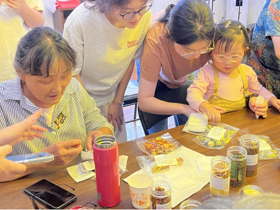 除此之外,團隊還開展了DIY養生茶活動,志愿者拿出事先準備好的陳皮、金桔、金銀花等常見的養生藥食擺放整齊,老人和孩子可以自主選擇需要的配料進行茶包配置,在活動過程中,大家通過親手配置學習到了各種食材的屬性及功能。通過親身實踐,在場的各位都將養生知識內化于心,相信這個夏天,社區居民一定能有效運用今天所學,調理自己和家人的身體,度過一個健康愉快的暑期。