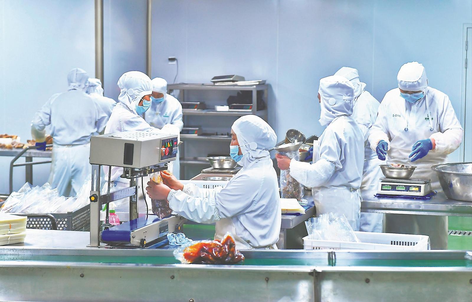 近日,六安市裕安區勝緣食品有限公司,工人們正在包裝紅燒鵝塊。記者程兆攝