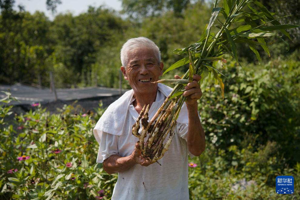 8月25日,在安徽省銅陵市義安區天門鎮新華村,村民朱樹清展示采收的銅陵白姜。新華社記者 張端 攝
