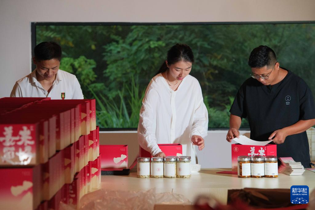 9月14日,在安徽省銅陵市郊區大通鎮大院村山禮白姜工坊,新農人胡婷婷(中)和丈夫程陵(右)在包裝銅陵白姜。新華社記者 張端 攝