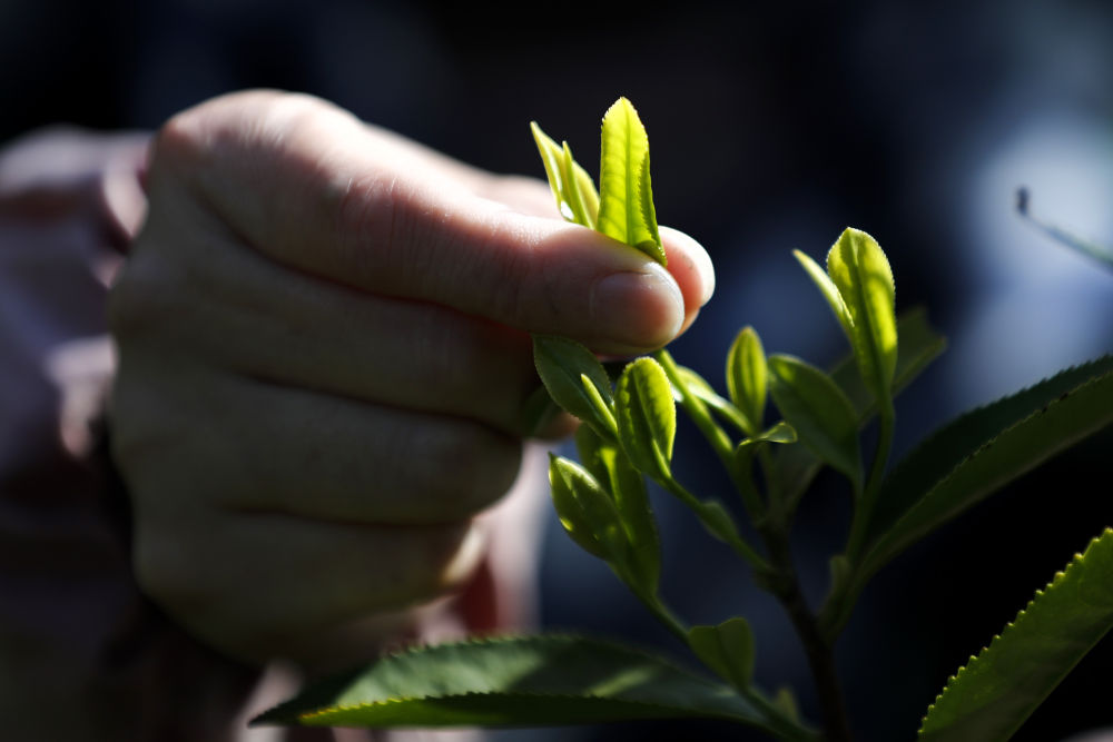 3月28日,茶農在安徽省黃山市祁門縣一處生態茶園里采摘祁門紅茶鮮葉。