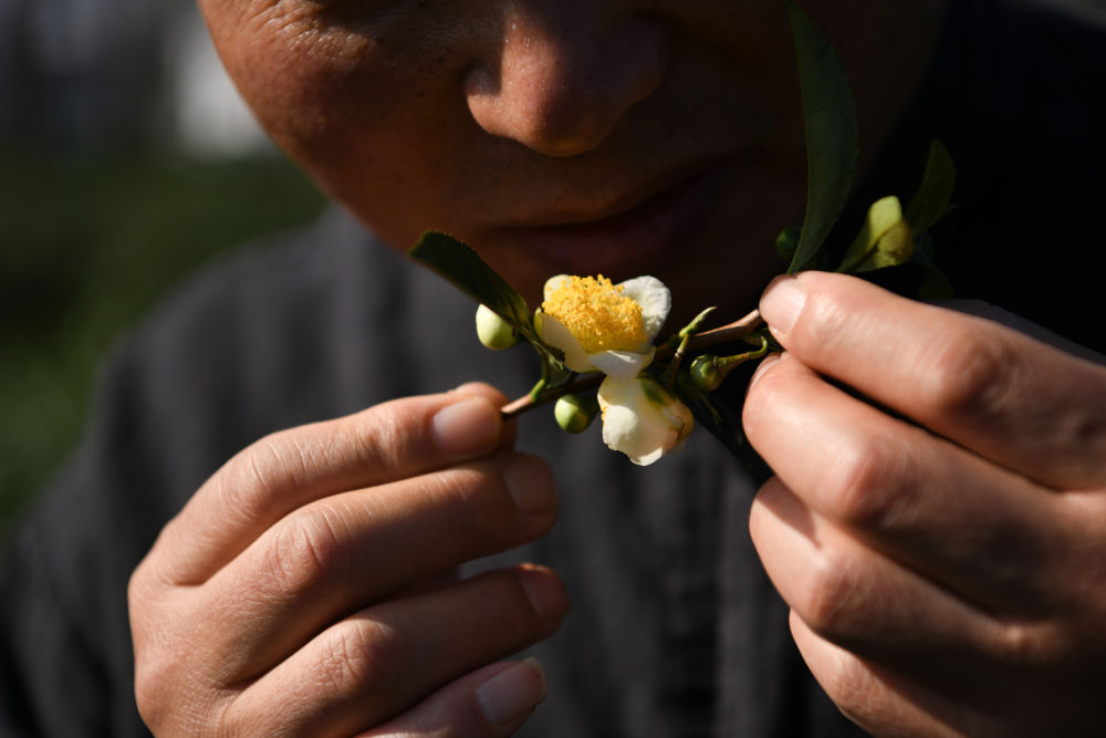 11月26日,王昶在安徽省黃山市一處茶園里感受茶花的香氣。