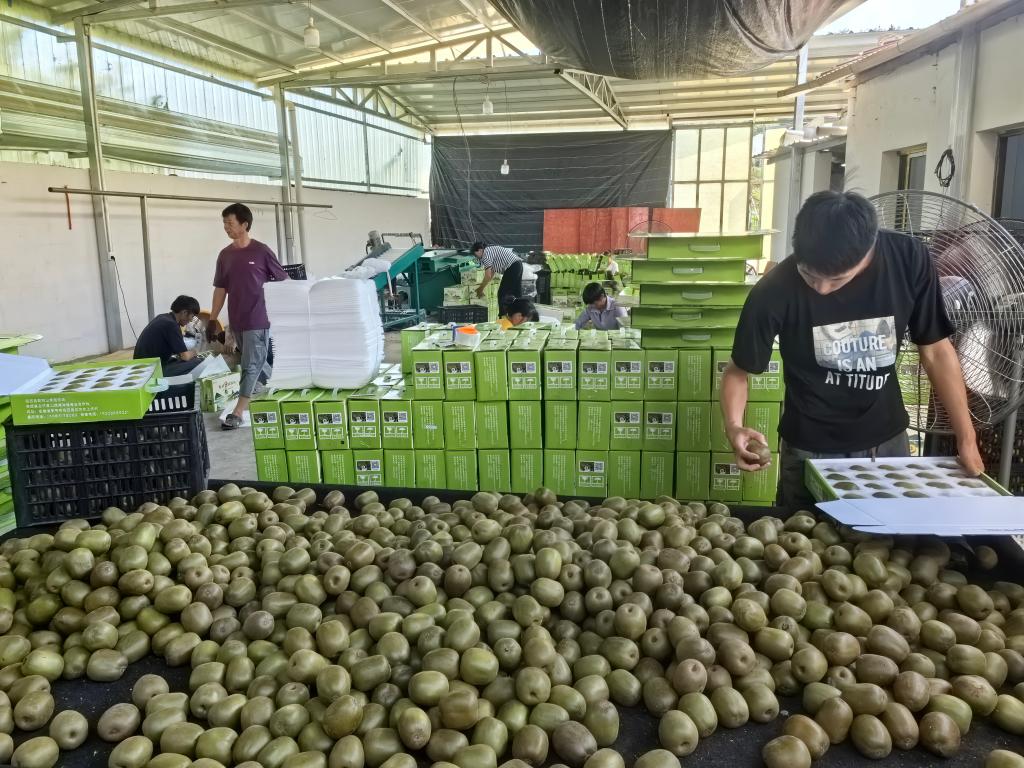 9月19日,在岳西縣古坊鄉徐志鵬的果園分揀倉庫,工人正在給獼猴桃打包發貨。新華社發。(受訪者供圖)