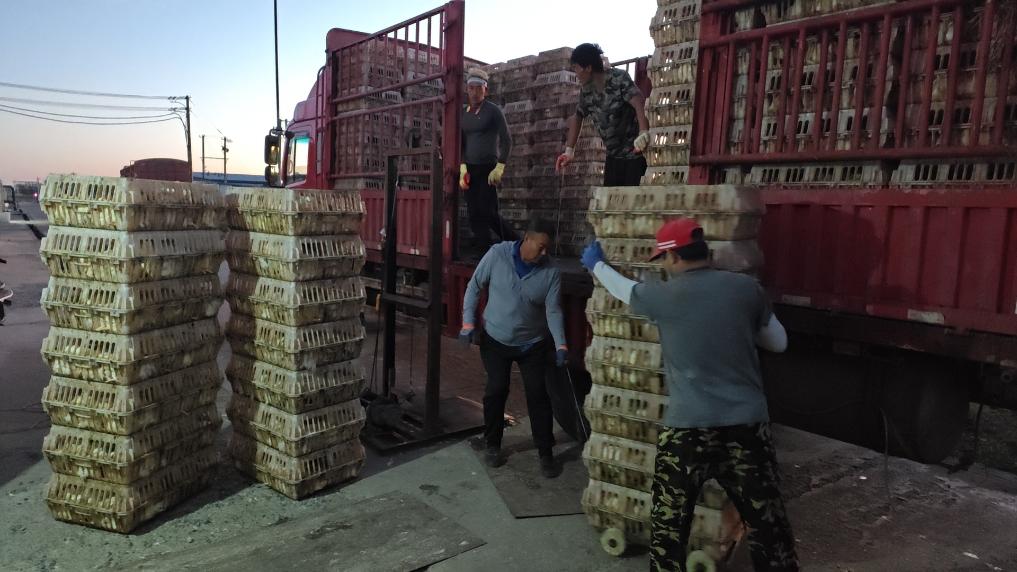 9月22日清晨,立業養殖農場工人正在將肉雞裝車。(受訪者供圖)