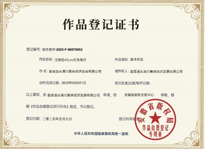歙縣魚燈產業的日益完善,勾勒出民間文藝可持續發展的路徑,為同類文化遺產的活化提供了極具價值的范本。筑牢版權保護根基,把民間文藝作品變產品、把產品變產業,可持續的活態傳承之路便會越走越寬。