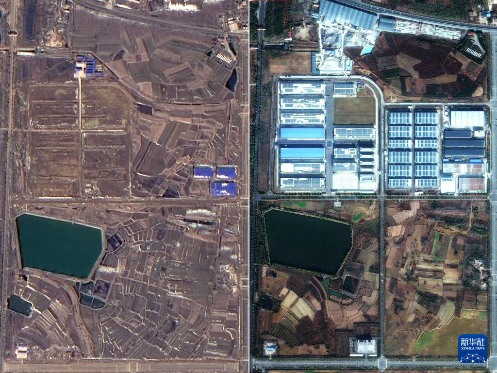 拼版照片:左圖為2018年2月衛星記錄的小崗產業園初期景象;右圖為2023年11月衛星記錄的已入駐多家企業的小崗產業園。新華社發(高分辨率對地觀測系統安徽數據與應用中心供圖)