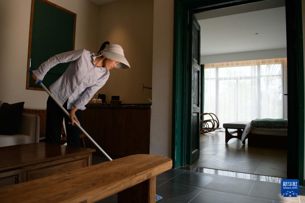 8月22日,工作人員在小崗村的“小崗村宿”民宿內進行清潔工作。新華社記者 張端 攝