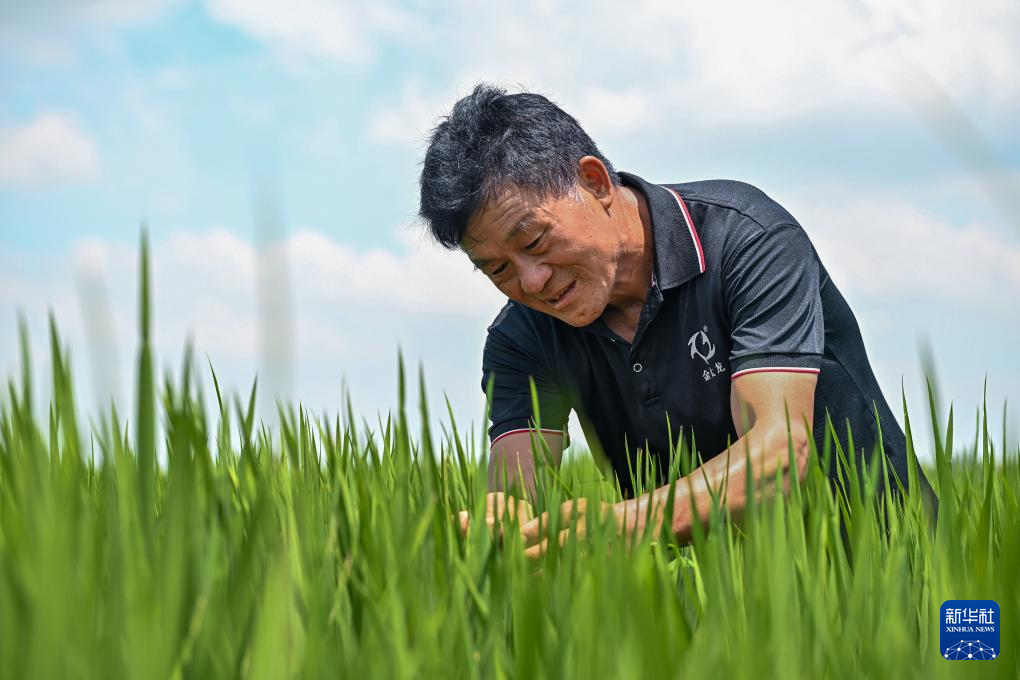 7月25日,小崗村種糧大戶程夕兵在田里觀察水稻長勢。新華社記者 李鑫 攝