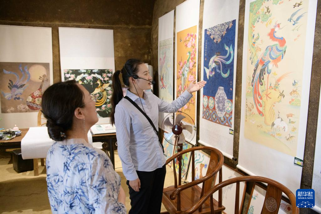 8月22日,嚴妹(右)在小崗村“當年農家”院落里向游客介紹非物質文化遺產鳳畫。嚴妹是“大包干”帶頭人嚴金昌的孫女,2019年她從學校畢業后回到家鄉,成為滁州市小崗村旅游投資管理股份有限公司的一名講解員。新華社記者 張端 攝