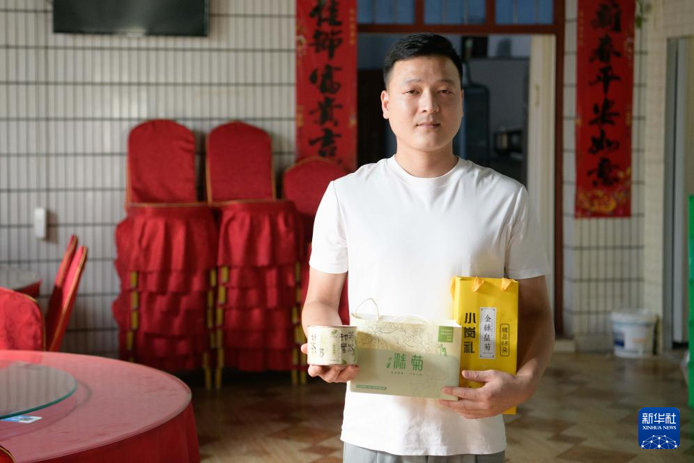 8月22日,小崗村青年吳斌在自己開辦的農家樂里展示小崗村特色農產品。新華社記者 張端 攝