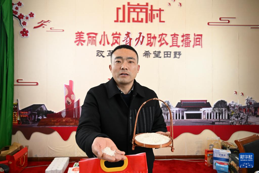 1月31日,在小崗村的“美麗小崗青力助農直播間”,主播楊偉介紹本地一家米廠的香米。新華社記者 黃博涵 攝