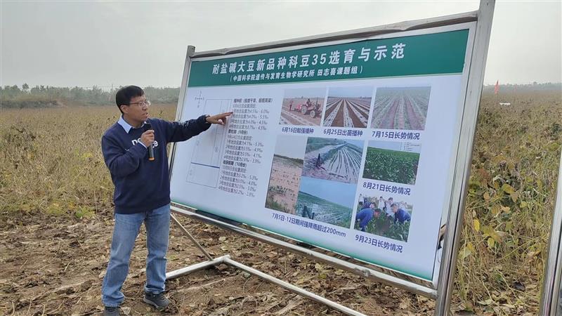 近日,中國耐鹽大豆育種研究和示范推廣工作獲得重大進展——中國科學院遺傳與發育生物學研究所(中科院遺傳發育所)田志喜研究團隊成功選育的耐鹽高產大豆新品系“科豆35”,在山東省東營市黃河入??诘牡湫望}堿地上采用完全天然雨養方式進行示范種植,通過田間實收測產顯示畝產為270公斤以上。