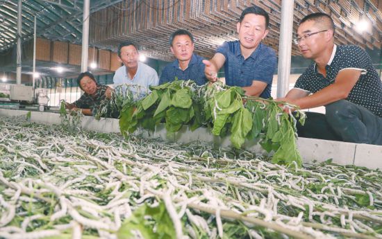 9月4日,安徽省農科院蠶??萍继嘏蓤F專家黃德輝(右二)在岳西興煒蠶桑種養專業合作社指導蠶桑大戶飼養秋蠶。2022年以來,安徽省農業科學院成立“岳西蠶桑復合型科技特派團”,派出15名由蠶桑、繭絲綢等行業專家組成的團隊,利用新品種、新技術、新模式、新裝備為當地的養蠶大戶、合作社、相關企業和蠶桑專業村提供技術指導和服務。(徐國康 攝)